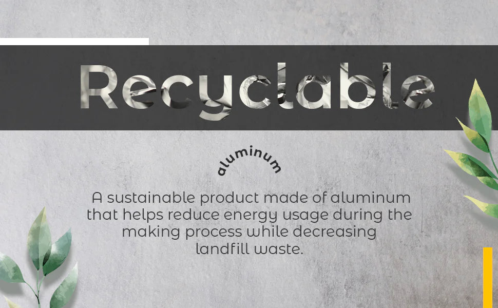 ECO-FRIENDLY. A sustainable product made of recycled aluminum that helps reduce energy usage during the making process while decreasing landfill waste.